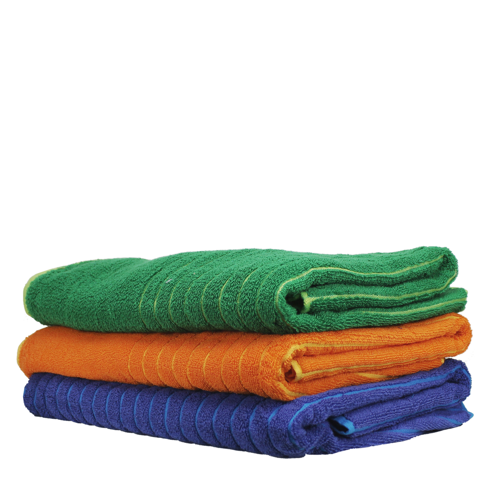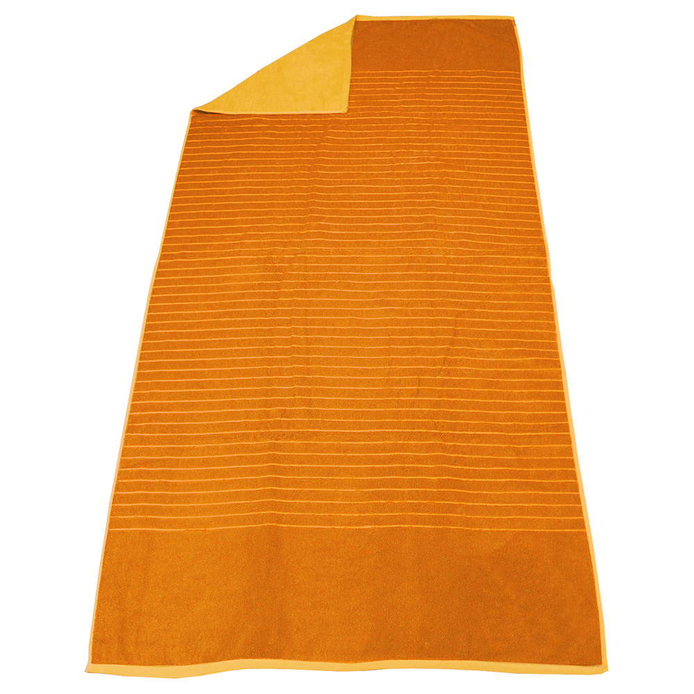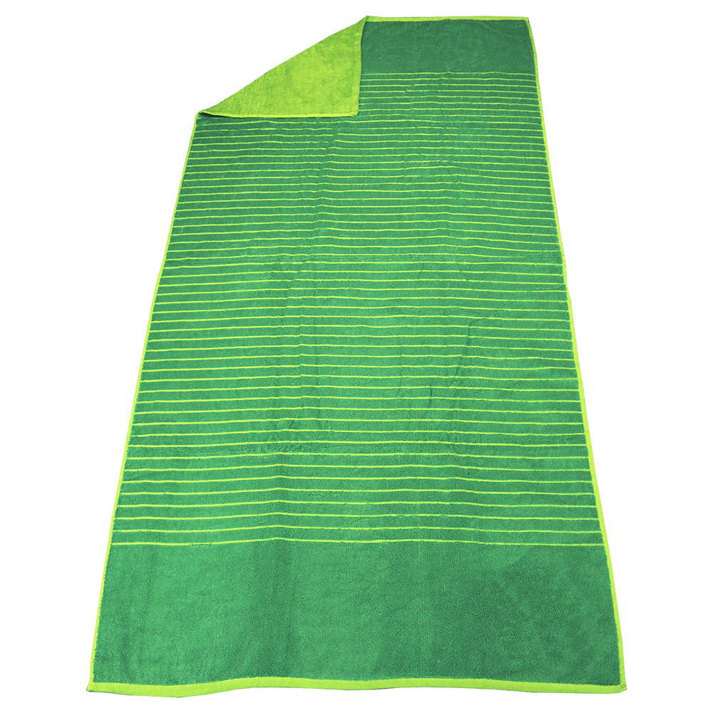 Our Bayside Reversible Stripe Beach Towel is one of our largest towels, measuring 34" W x 72" L. One side features a trendy, jacquard stripe pattern, and the other a vibrant, solid color.