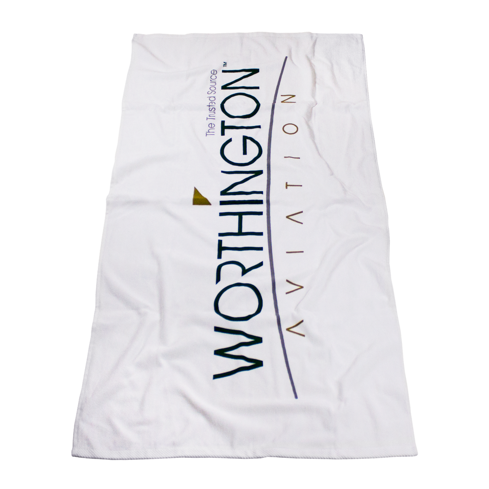 Our Standard USA White Beach Towel is a 100% cotton towel manufactured and decorated in the US. Each towel measures 30" W x 60" L.