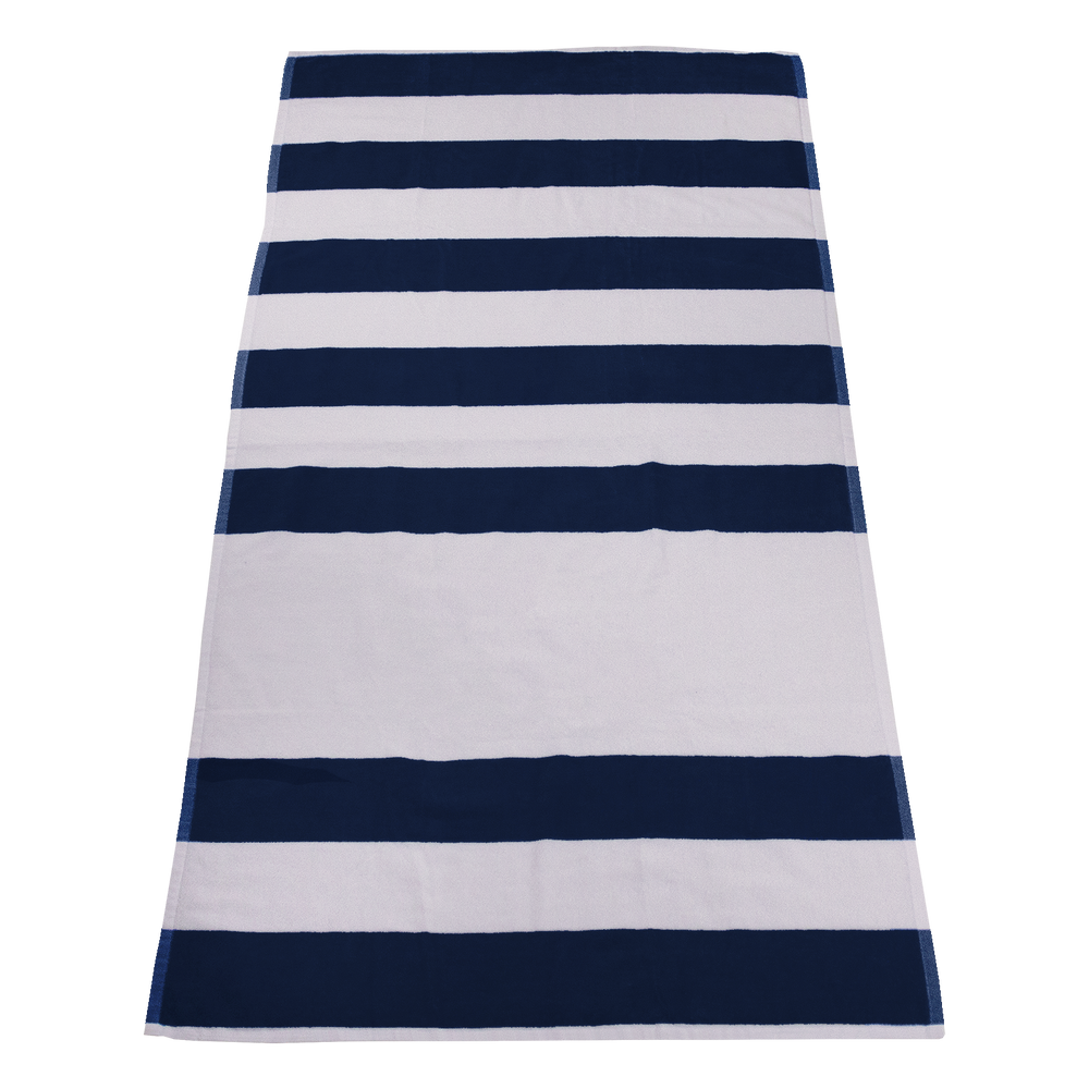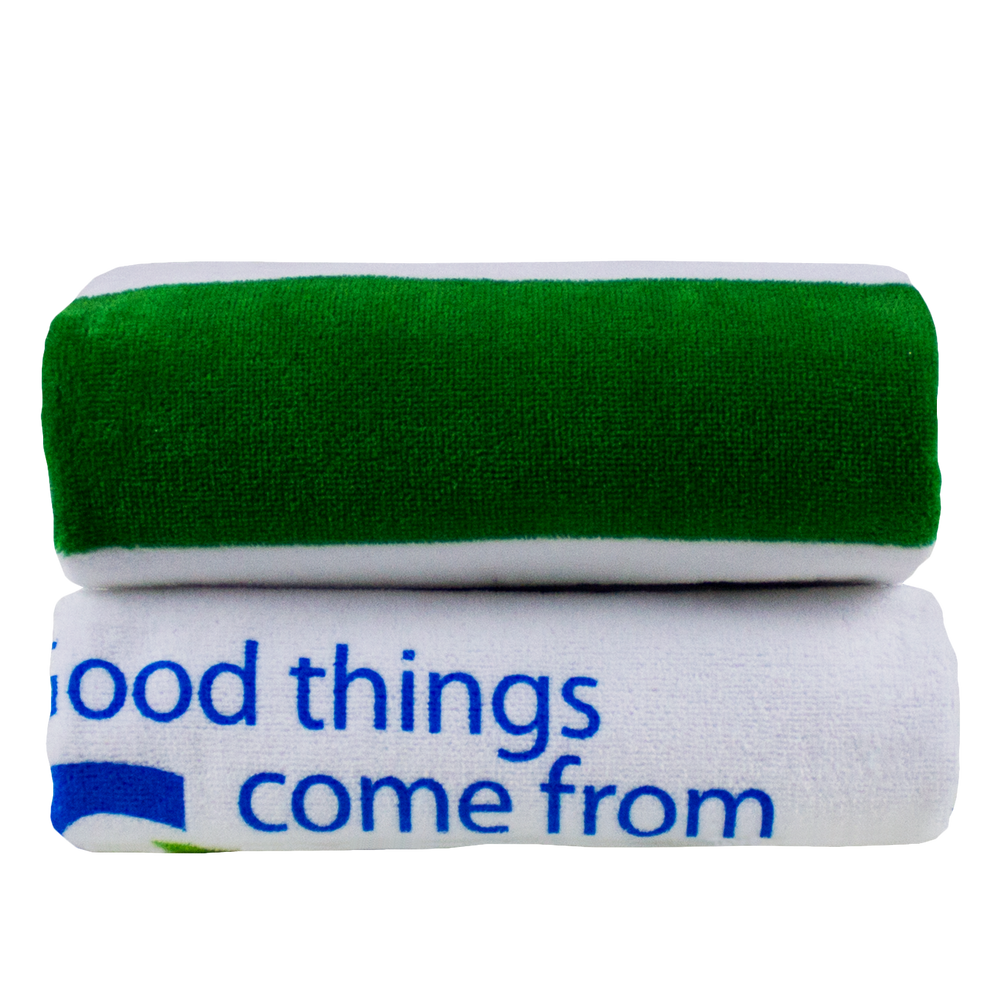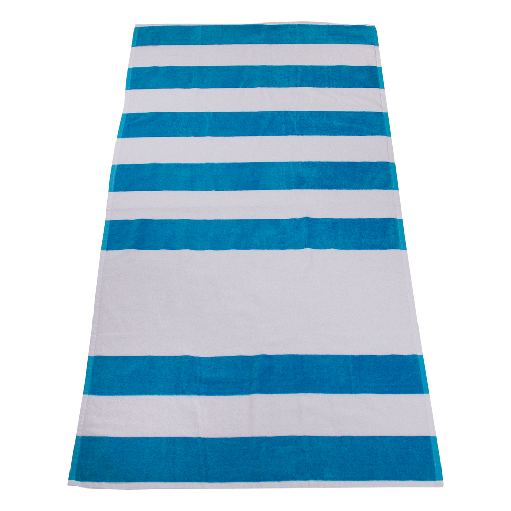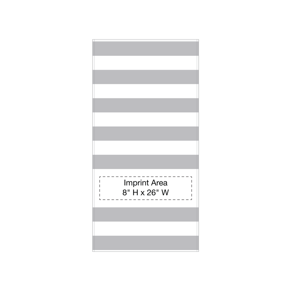 We are taking a "classic" stripe beach towel one step beyond. This towel has a unique design that allows you to print your logo without sacrificing the traditional cabana stripe towel look. This beach towel has an ample imprint area of 8" in height and 26" in width that you can use to create a great statement with by customizing the area with your own design or logo. Your logo will then be framed by the surrounding cabana stripes of the Horizon beach towel. Available in white/red, white/royal, white/lime, white/turquoise, and white/grey, the Horizon beach towel allows you to explore the color options that would look best with the statement you're trying to make. Overall towel dimensions are 30 inches x 60 inches at 13 pounds per dozen.
