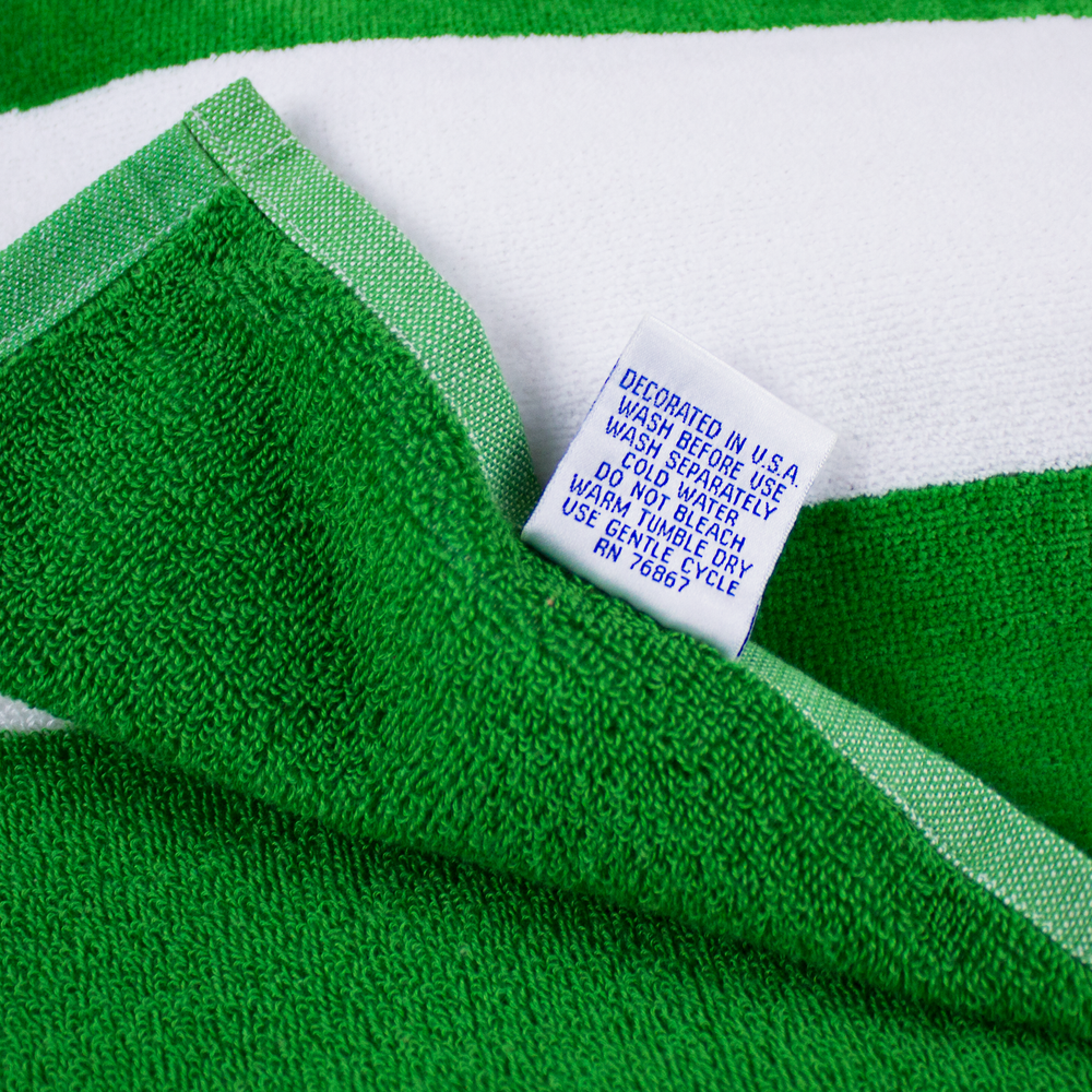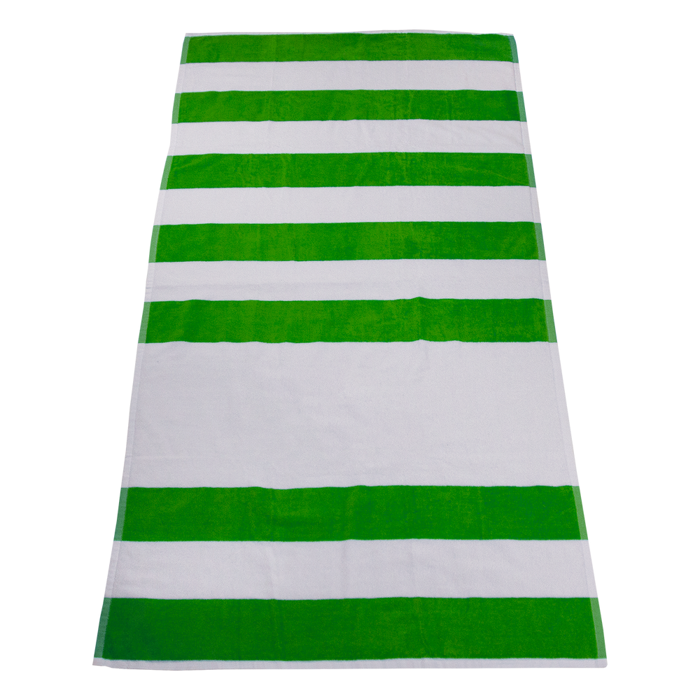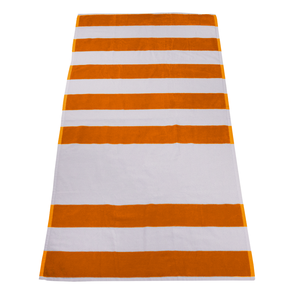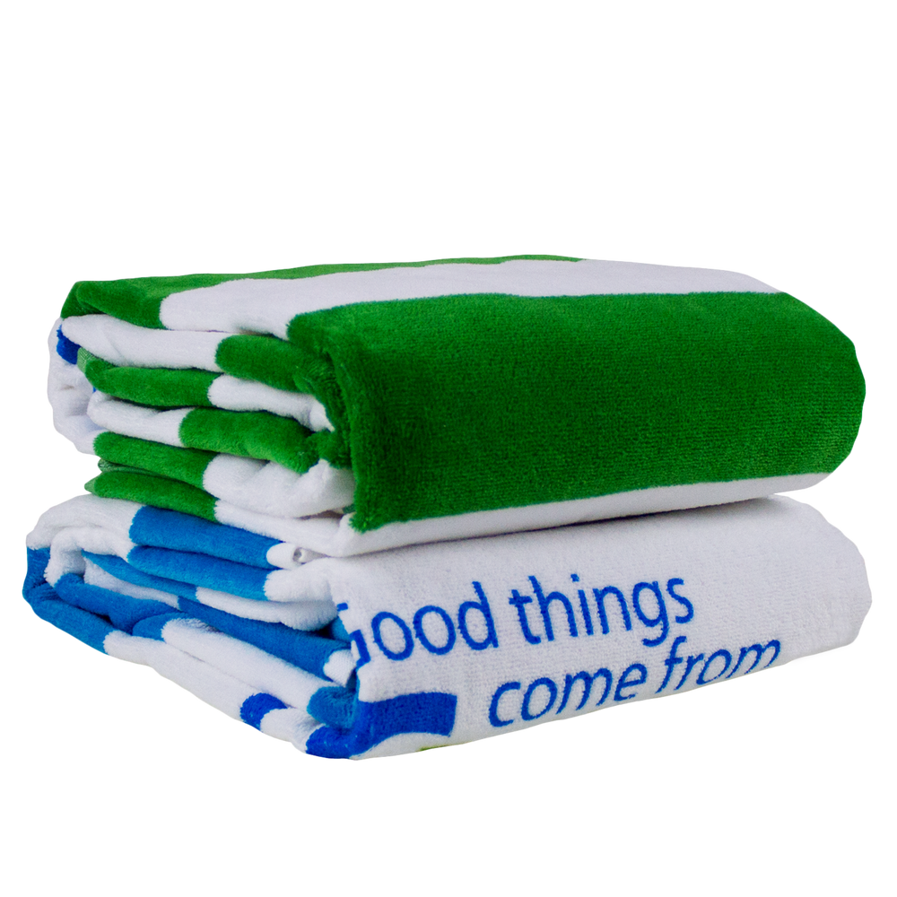 We are taking a "classic" stripe beach towel one step beyond. This towel has a unique design that allows you to print your logo without sacrificing the traditional cabana stripe towel look. This beach towel has an ample imprint area of 8" in height and 26" in width that you can use to create a great statement with by customizing the area with your own design or logo. Your logo will then be framed by the surrounding cabana stripes of the Horizon beach towel. Available in white/red, white/royal, white/lime, white/turquoise, and white/grey, the Horizon beach towel allows you to explore the color options that would look best with the statement you're trying to make. Overall towel dimensions are 30 inches x 60 inches at 13 pounds per dozen.