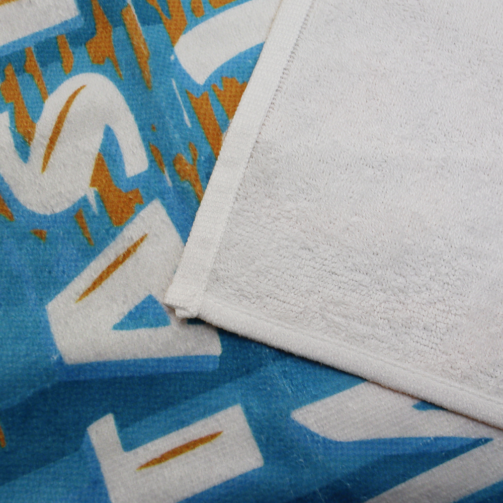 Our Large Full Color Print Beach Towels offers edge-to-edge printing in unlimited color! Made from a blend of polyester (35%) and combed Turkish Cotton (65%), our Full Color print towels remain colorfast and fade resistant while having a luxurious texture. The long fibers of the Turkish Cotton produce an extraordinarily strong, long-lasting product that resists pilling. The base of our towels is a bright white, producing a vibrant print. The face of the towel is sheared short to promote optimum ink penetration with extremely little white show-through. The back of the towel is looped to provide extra surface area for maximum absorbency, which will always remain white even when the towel is printed. The large 35" W x 60" H size gives you ample room to customize the towel with your full color logo, artwork, or photo. Our Full Color Print towels are printed using a CMYK format; RGB and Pantone will need to converted. For standard designs, vector art is preferred. Photographic images with a minimum 150 dpi produce the most ideal print. If in doubt, please submit layered files and let our artists build the best layout for you.