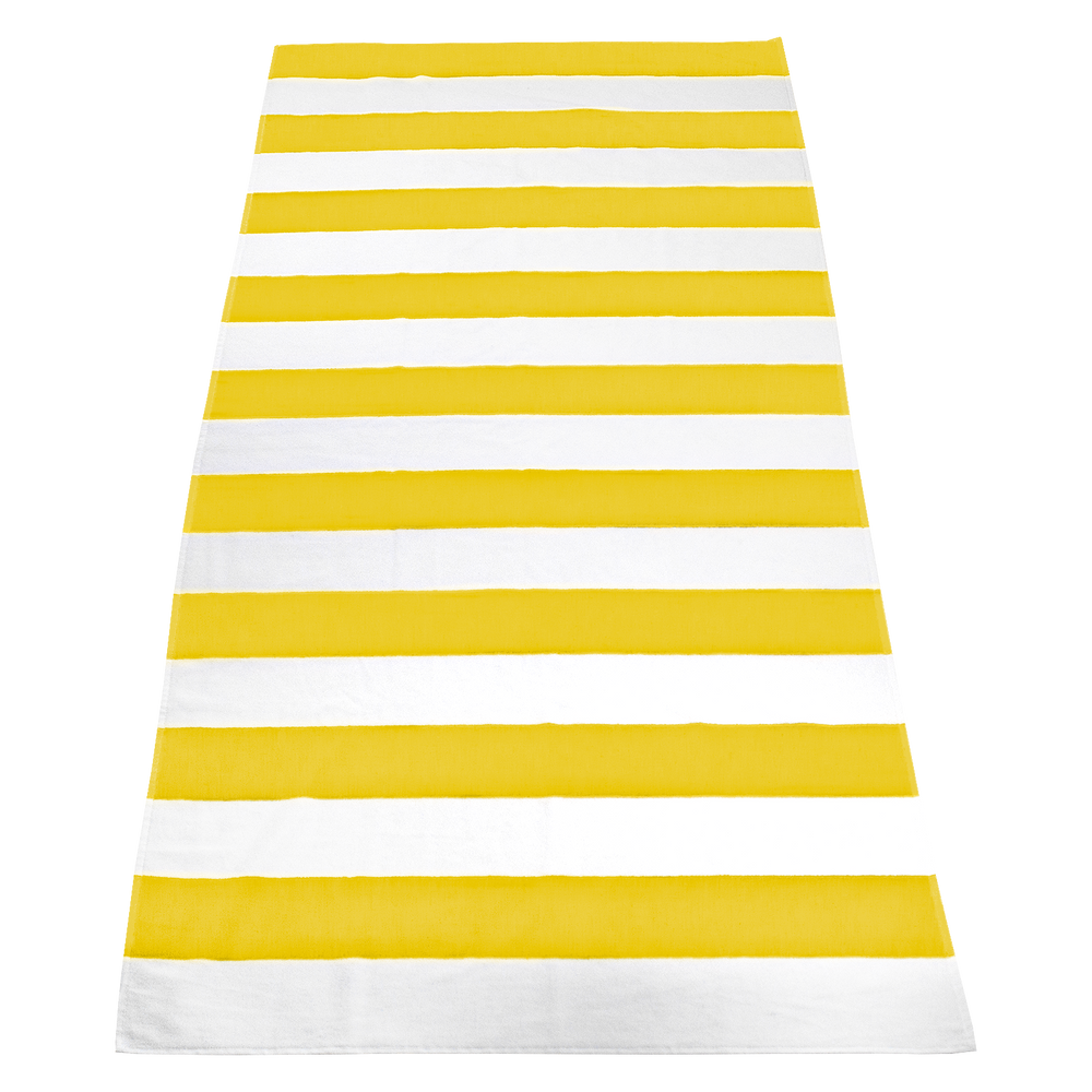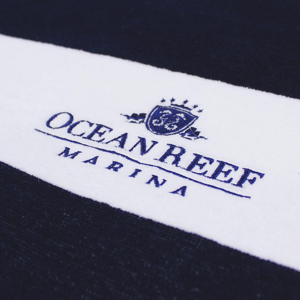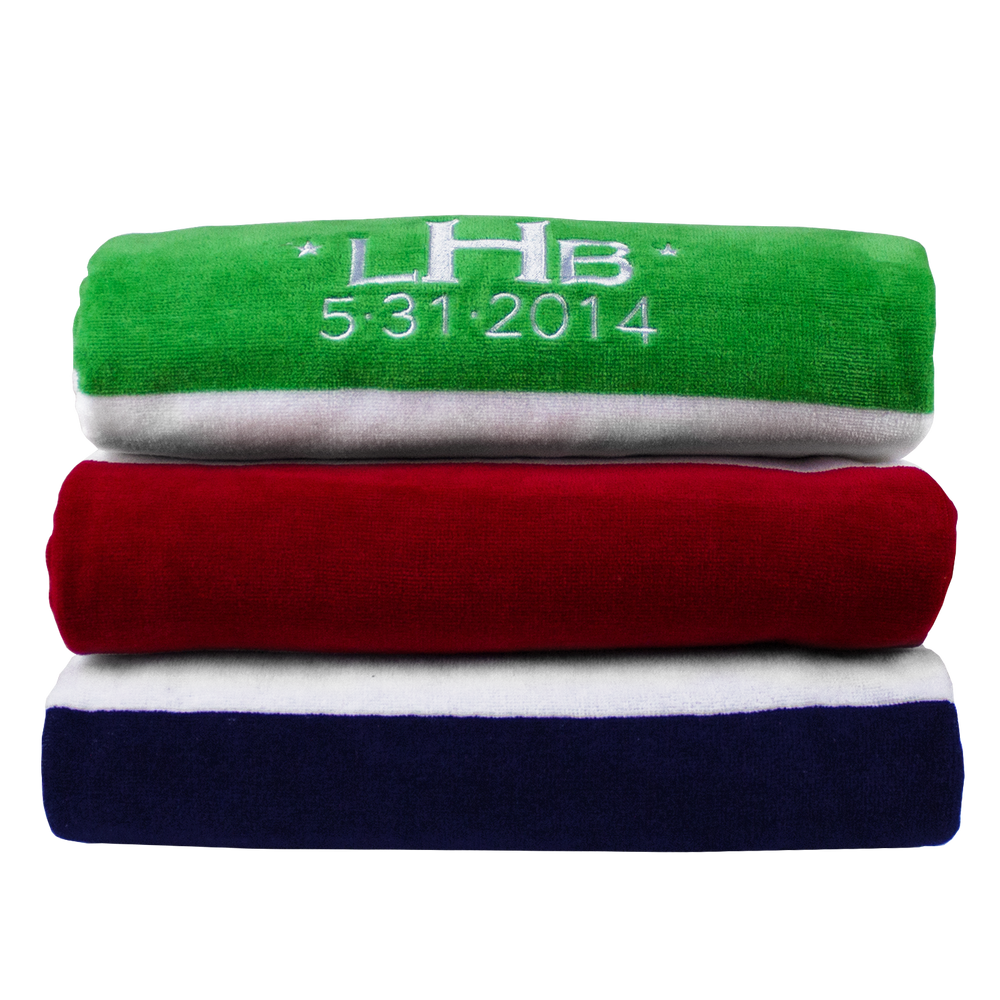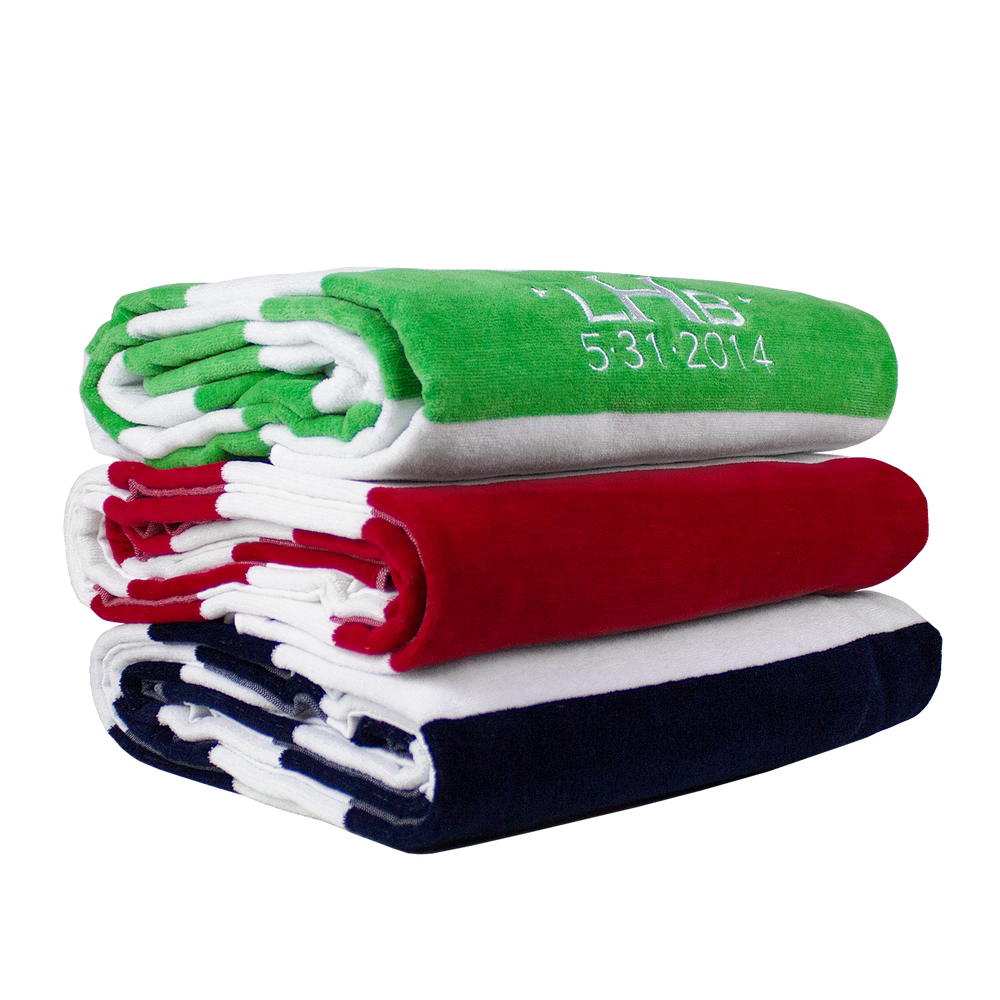 Our elegant oversized Santa Maria beach towels can be embroidered or imprinted with important company branding. This style of luxury beach towel comes with the wide stripes that work very well for logo or corporate signature branding. We offer our classy Santa Maria beach towels in yellow/white, brown/beige, lime/white, navy/white, and red/white color combinations. User our contact link to discuss printing possibilities.